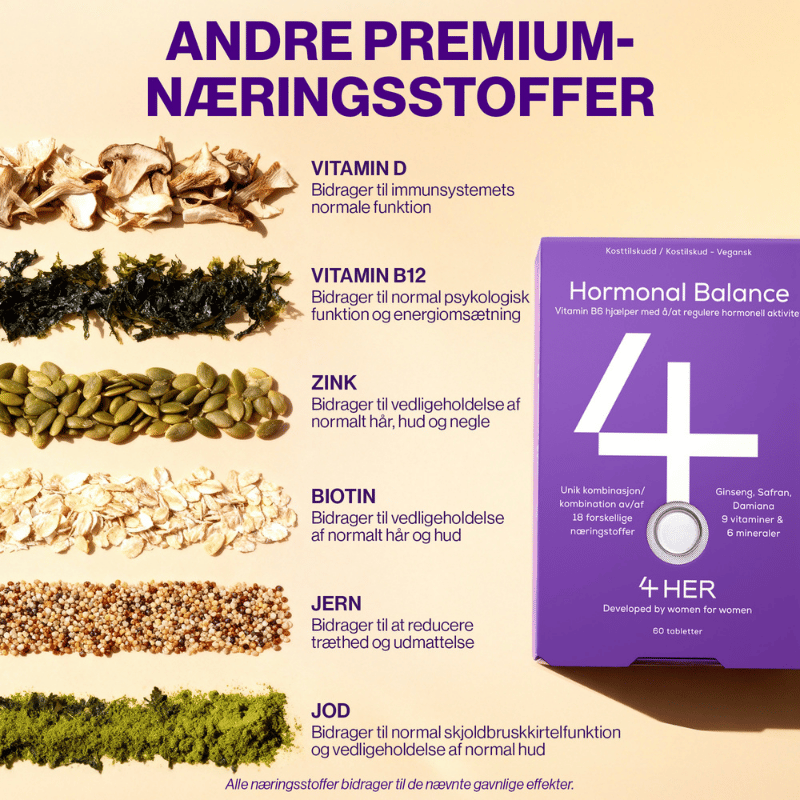 4 HER Hormonal Balance er et kosttilskud til kvinder, der indeholder vitamin B6 og zink. Vitamin B6 bidrager til at regulere hormonaktiviteten og bidrager til at mindske træthed og udmattelse. Zink bidrager til en normal frugtbarhed og reproduktion. I en travl hverdag kan svingende hormoner påvirke både energi og overskud; dette veganske tilskud indeholder desuden planteekstrakter såsom damiana og ginseng.