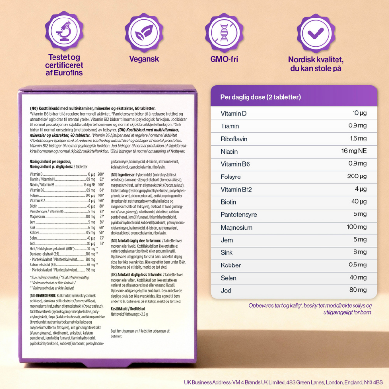 | Næringsinnhold per daglig dosis (Næringsstoff, 2 tabletter, *%RI): Vitamin D 10 μg 200*; Thiamin (Vit. B1) 0,9 mg 82*; Riboflavin (Vit. B2) 1,6 mg 114*; Niacin (Vit. B3) (NE) 16 mg 100*; Vitamin B6 0,9 mg 64*; Folsyre 200 μg 100*; Vitamin B124 μg 160*; Biotin 40 μg 80*; Pantothensyre (Vit. B5) 5 mg 83*; Magnesium 100 mg 27*; Jern 5 mg 36*; Zink 6 mg 60*; Kobber 0,5 mg 50*; Selen 40 μg 73*; Jod 80 μg 53*; Ginsengekstrakt 30 mg - (til)svarende til tørket/tørret ginsengrod 150 mg; Damiana-ekstrakt 100 mg - (til)svarende til tørket/tørret damianablad 300 mg; Safran-ekstrakt 66 mg - (til)svarende til tørket/tørret safran 198 mg. *%RI = % af referenceindtag - Referenceindtag er ikke fastsatt |