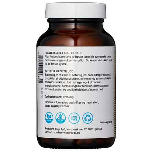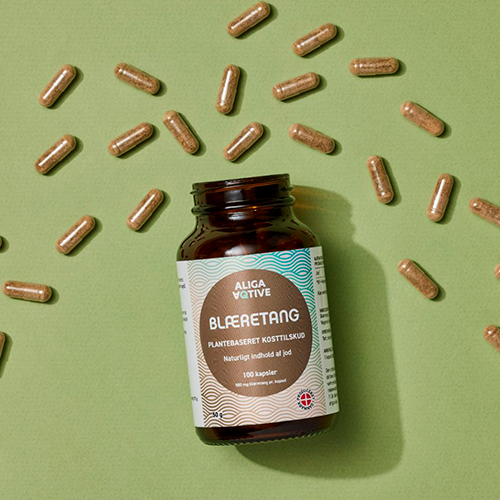 Granuleret blæretang i vegansk kapsel Aliga Aqtives blæretang er høstet langs de europæiske kyster. Du kender den sikkert også fra de danske kyster.