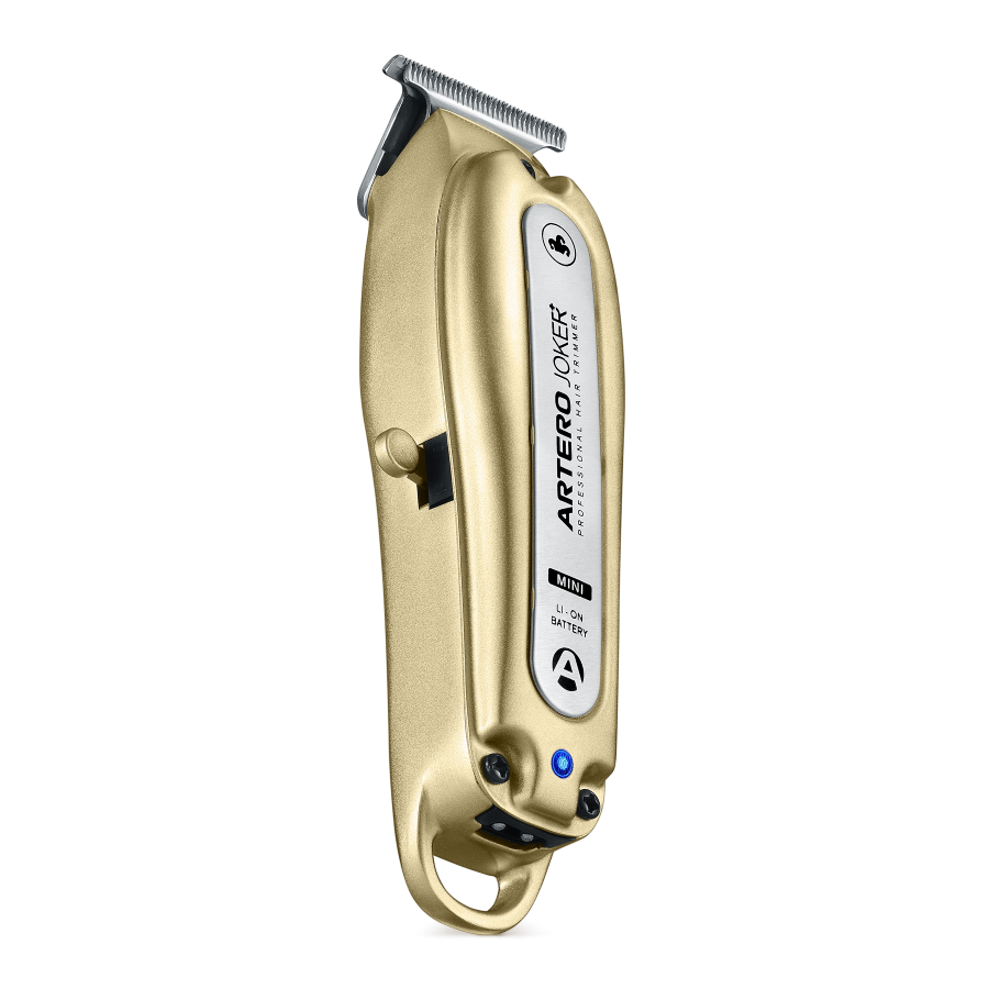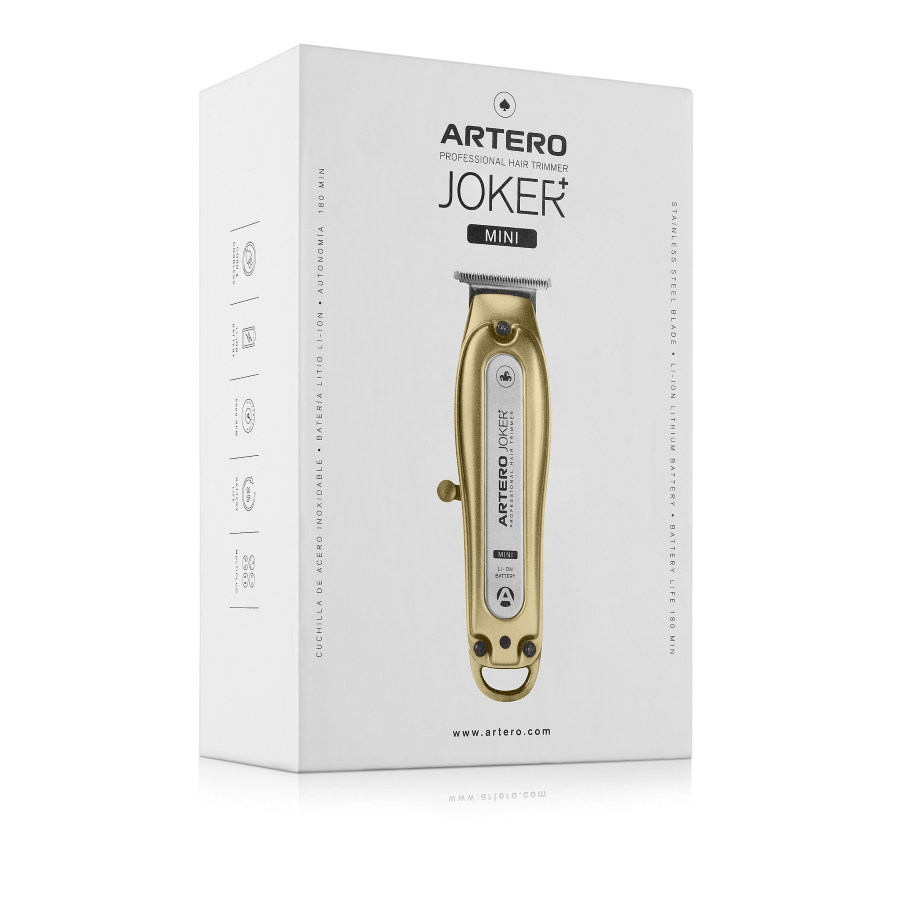 Joker er en professionel hår trimmer med T-cut skær fra ARTERO i bronze look. Lithium batteri med op til 3 timers batteritid på fuld opladning. Skæret er i stål og har en bredde på 4.0 cm. Og går helt tæt på huden 0,1-0,2 mm. Der medfølger en beskyttelseskinne til skæret. Opladningstiden er 120 minutter. Den kan bruges med og uden ledning. Vægt: 217 gram. Medfølger: 3 afstandskamme 2 - 3 og 4mm, olie og lille rengøringsbørste samt 4 stik til EU-US-AUS-JP.