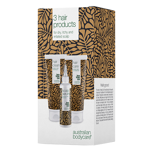 Hovedbundspakke med hovedbundskur, Tea Tree shampoo og balsam. Afhjælper skæl, tør hovedbund, fedtet hår og kløende hovedbund. Giver pleje og fugt.