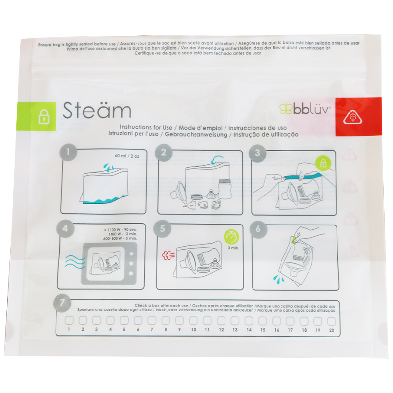 Genanvendelige steriliseringsposer, der nemt og hurtigt steriliserer sutter, flasker, dinapper, brystpumpe-dele, tandbørstehoveder og andre produktkomponenter, der kan bruges i mikrobølgeovnen.