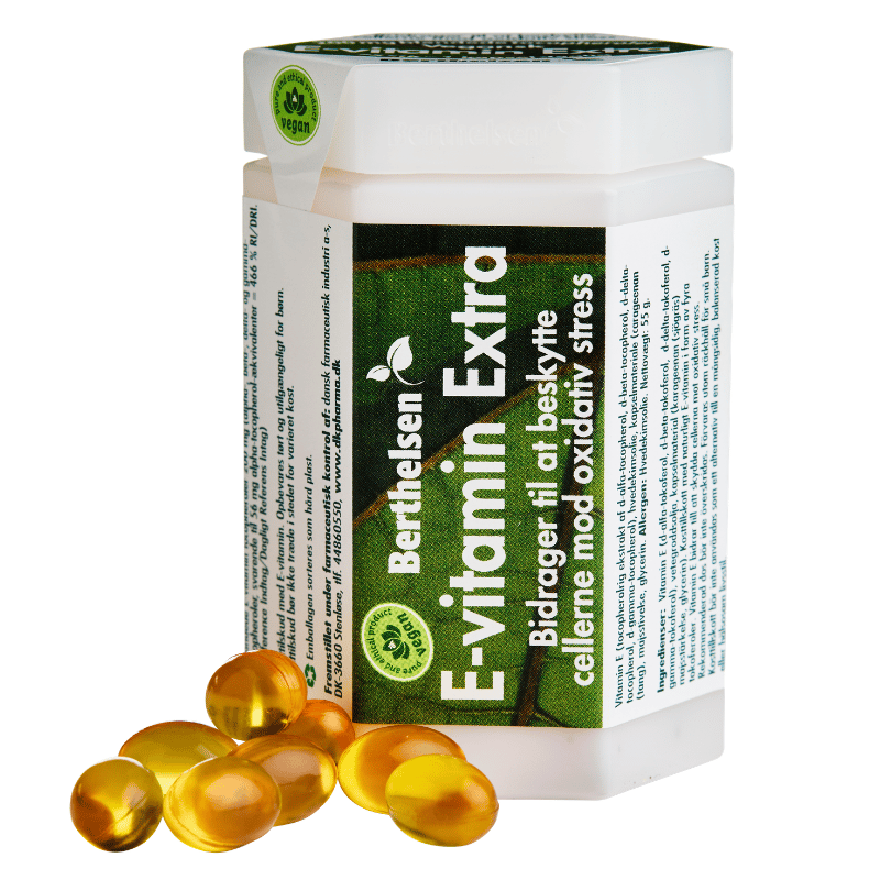 Berthelsen E-vitamin Extra: Vegansk tilskud med alle fire naturlige E-vitaminformer, beskytter celler mod oxidativt stress. Fri for laktose, gluten og tilsætningsstoffer.