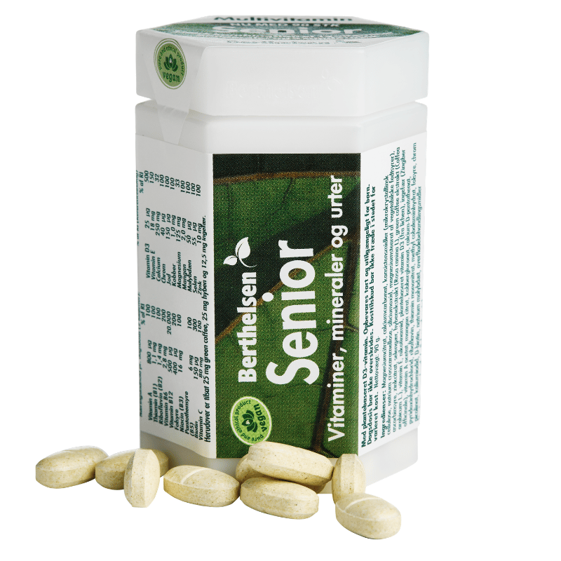 Berthelsen Senior Vegan er et vegansk kosttilskud med 12 vitaminer, 9 mineraler og urter – ideelt til dig over 50 år.
