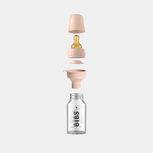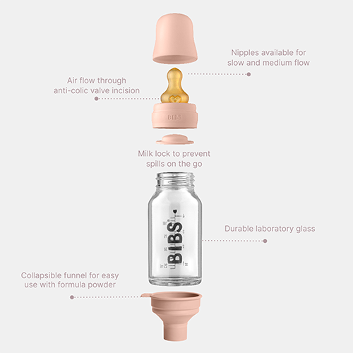 BIBS sutteflaske er omhyggeligt designet til babyer og forældre. Selve flasken er lavet af borosilikatglas, der tåler høje temperaturer, er holdbart, afgiver ingen skadelige stoffer til mælken og meget mere.
