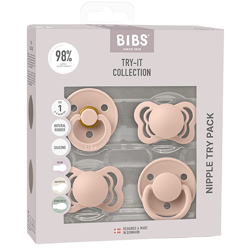 I BIBS Try-it Kollektion 4-pack får du fire forskellige sutter (Colour, De Lux, Supreme og Couture), med et udvalg af fire forskellige nipple-forme (rund, symmetrisk og anatomisk) og materialer (naturgummilatex og silikone).