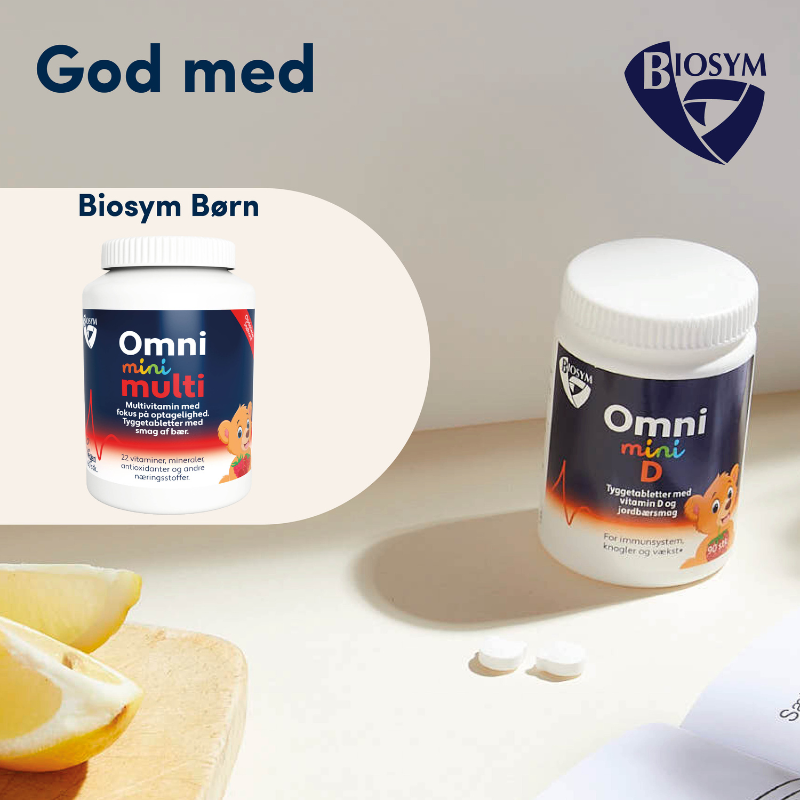 Biosym OmniMINI D er et børnevenligt kosttilskud med D3-vitamin i bamseformede tyggetabletter. Støtter barnets knogler og immunforsvar og har en mild, naturlig jordbærsmag.