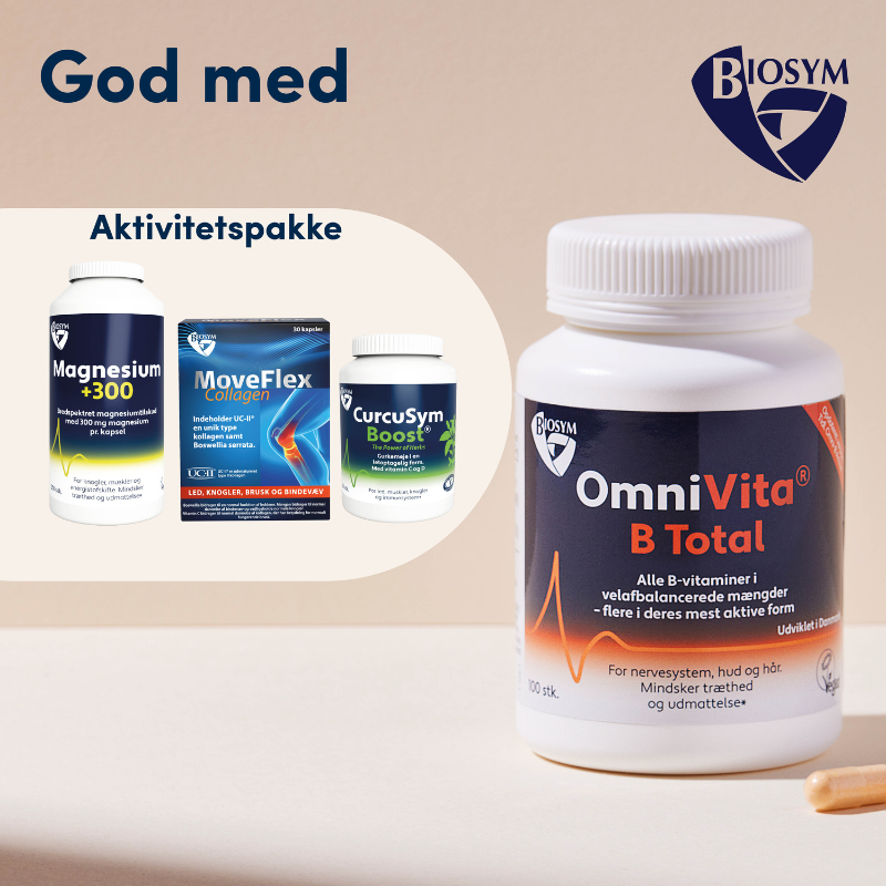 Biosym OmniVita B Total samler alle 8 B-vitaminer i aktiv form, er 100% vegansk og støtter energi, nervesystem, hud, hår og leverfunktion.