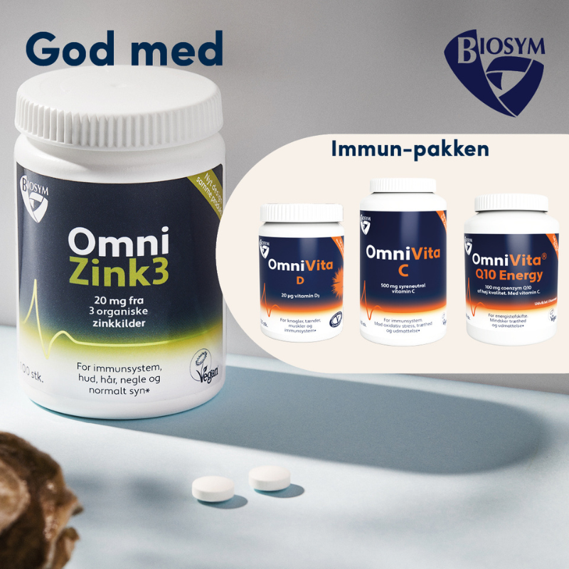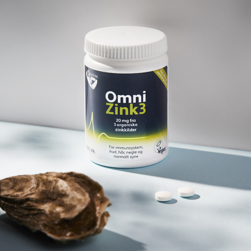 Biosym OmniZink3 giver 20 mg letoptageligt, vegansk zink fra tre kilder, styrker immunforsvar, hud, hår og testosteron – dokumenteret effekt.