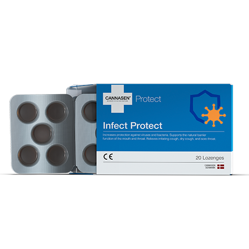Mærk lindring for en irriteret hals og tør hoste. CANNASEN® Infect Protect halstabletter hjælper med at berolige ubehag og styrke dit forsvar, så du kan komme irritationen i forkøbet.