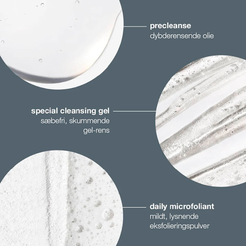 Dobbelt afrensning morgen og aften ved at skumme en mængde Precleanse på størrelse med en ærte for at smelte urenheder og make-up væk fra huden. Gør hænderne våde og fortsæt med at massere for at skabe en let, mælkeagtig emulsion. Skyl med lunkent vand. Skum forsigtigt en lille mængde Special Cleansing Gel i fugtede hænder og påfør på fugtet ansigt og hals. Skyl med varmt vand. Eksfolier en gang om dagen med Daily Microfoliant. Start med at skumme pudderet op i våde hænder for at skabe en luftig skum og påfør derefter huden med blide cirkulære bevægelser. Skyl grundigt af med lunkent vand.