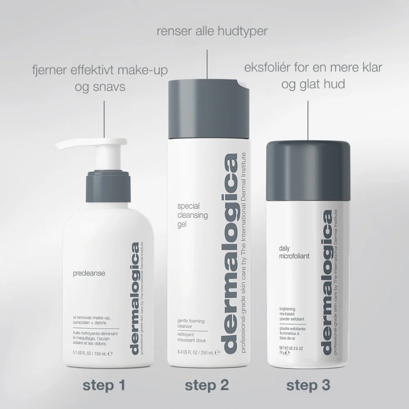 Oplev hudpleje i tre trin, der renser i dybden, forfiner hudens struktur og fremhæver din naturlige glød.
