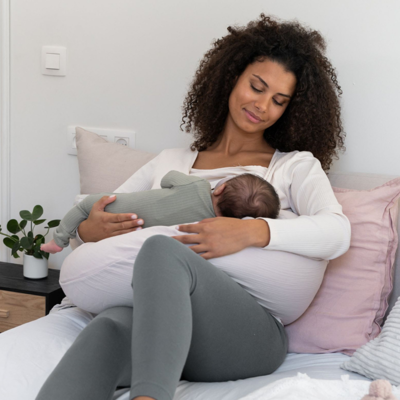 Doomoo kombineret amningspude og gravidpude Muslin er en stor, blød og ergonomisk boomerangformet pude. Den er fyldt med minimale og raslefrie EPS-kugler, som gør den formbar og giver optimal støtte til både den lille og store mor samt det voksende barn.