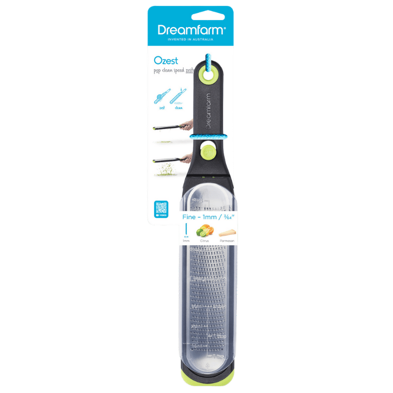 Ozest er et fint rivejern fra Dreamfarm, der er selvrensende med et enkelt tryk på en knap og er designet med en indbygget måleenhed. 441 superfine klinger er vinklet for at sikre en perfekt rivning, og det beskyttende sikkerhedscover klikkes nemt på, så du beskytter både rivejernet og fingrene under opbevaring i køkkenskuffen. Sikkerhedscoveret indeholder også måleangivelse op til 2 spsk, så du kan afmåle, hvor meget du river af de forskellige ingredienser. Særdeles velegnet til bageopskrifter. Tåler opvaskemaskine. BPA fri. Materiale: Polypropylen, rustfrit stål, TPE