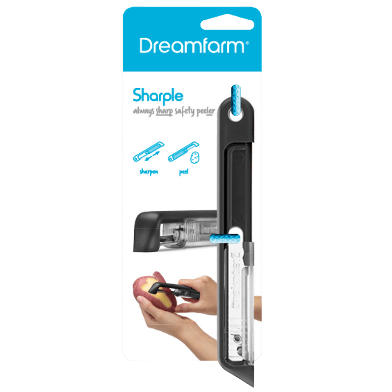 Sharple fra Dreamfarm er en grøntsagsskræller i en klasse helt for sig selv. Det unikke sikkerhedscover har en indbygget keramisk kuglespidser, der automatisk sliber klingen, hver gang beskyttelseshylsteret åbnes eller lukkes. Sharple er fremstillet med en knivskarp japansk klinge i rustfrit stål, som er designet til at holde hele livet, og ruster ikke i opvaskemaskinen. Det smarte håndtag giver dig maksimal kontrol - uanset om du er venstrehåndet eller højrehåndet. Spidsen på Sharple inkluderer en praktisk og yderst effektiv kartoffel-øje- og pletfjerner. Materiale er ABS, rustfrit stål, PCTG, keramik. BPA-fri. Tåler opvaskemaskine.