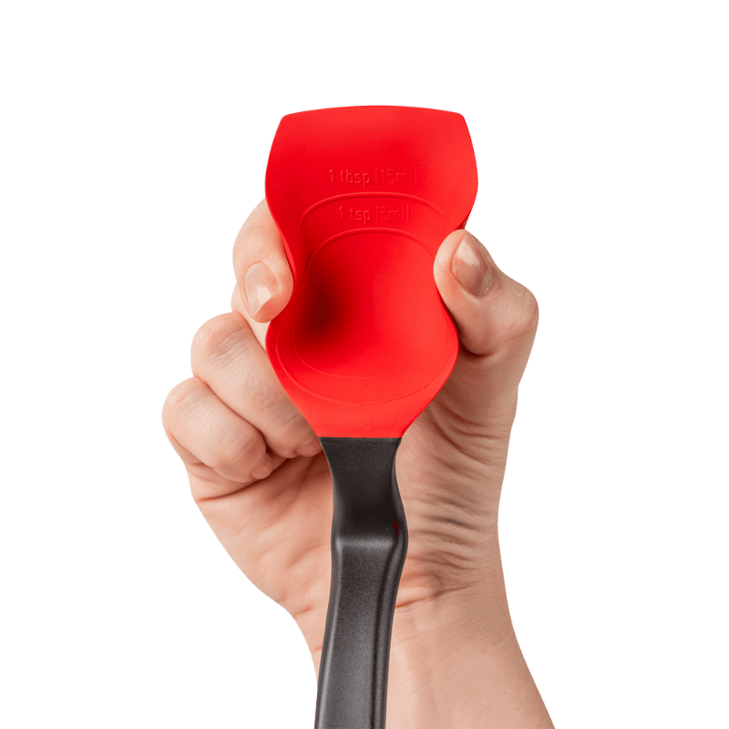Supoon fra Dreamfarm er en fantastisk grydeske i et stilsikkert, innovativt design. Den har en flad gummiskraberspids og fleksible sider til at skrabe din pande eller skål helt ren. Håndtaget er ensartet vægtet, så skeen ikke vælter ud af sauceskålen. Der er måleenheder (15 ml spsk & 5 ml tsk) i skeens hoved, så ud over at Supoon har en fantastisk skrabefunktion, kan du måle, røre, blande, øse og servere med den samme ske. Supoon er designet med et knæk på håndtaget, som gør, at den ikke kommer i kontakt med underlaget. Silikoneskeen er sikker at bruge på non-stick køkkengrej og er varmebestandig op til 260°C / 500°F. Materiale er nylon og silikone. Tåler opvaskemaskine. Fri for BPA.