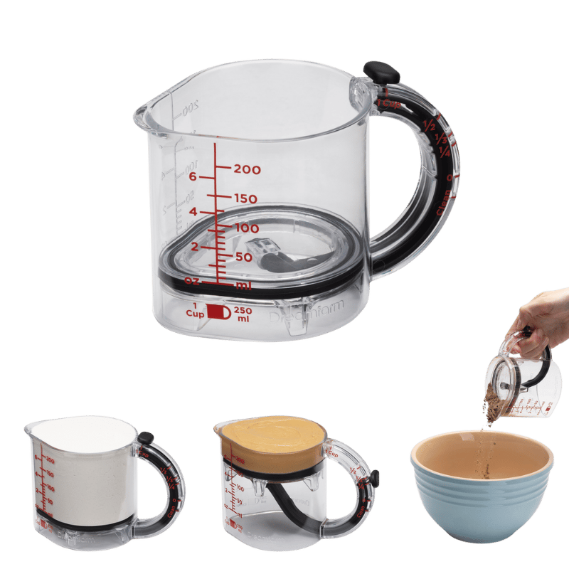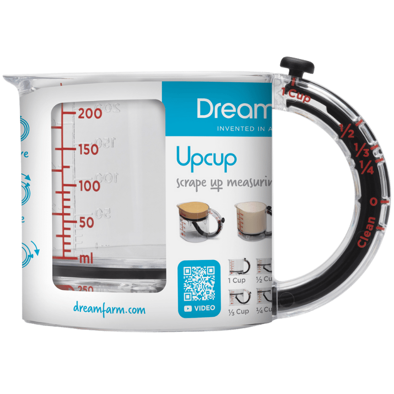 Upcup scrape up målebæger er et 4-i-1 justerbart målebæger, der skraber sig selv rent til våde, tørre og klæbrige ingredienser. Upcup's justerbare bund kan hæves, så man kan lave 250 ml / 1 kop, ½ kop, 1/3 kop og ¼ kop, alt sammen i et målebæger. En vandtæt forsegling omkring den justerbare bund presser Upcup ren, når den bevæger sig, hvilket gør Upcup perfekt til jordnøddesmør, mayonnaise, honning og andre klæbrige ingredienser. Den justerbare bund kan hæves helt op til toppen for at skrabe hver eneste dråbe ud, og den kan også tages ud for nem rengøring i opvaskemaskinen. De letlæselige ml- og oz-mål er begge trykt i rødt og præget i det BPA-fri Tritan, som aldrig smitter af. Tåler opvaskemaskine. Materiale er: Tritan og nylon.