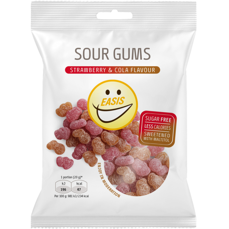 Sukkerfri EASIS Sour Gums er en blandet pose af to forskellige sure vingummier; en vingummi med smag af cola og en med smag af jordbær. Begge dele giver en lækker oplevelse med en syrlig coating og en sødere vingummi.