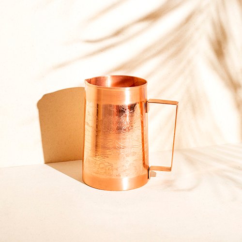 Produktet er behandlet udvendigt med en fødevaregodkendt lak, som giver den kønne og smukke overflade. Indvendig er der kun den rå kobber, som kendes for forskellige fordele ifølge Ayurvedisk livsstil.