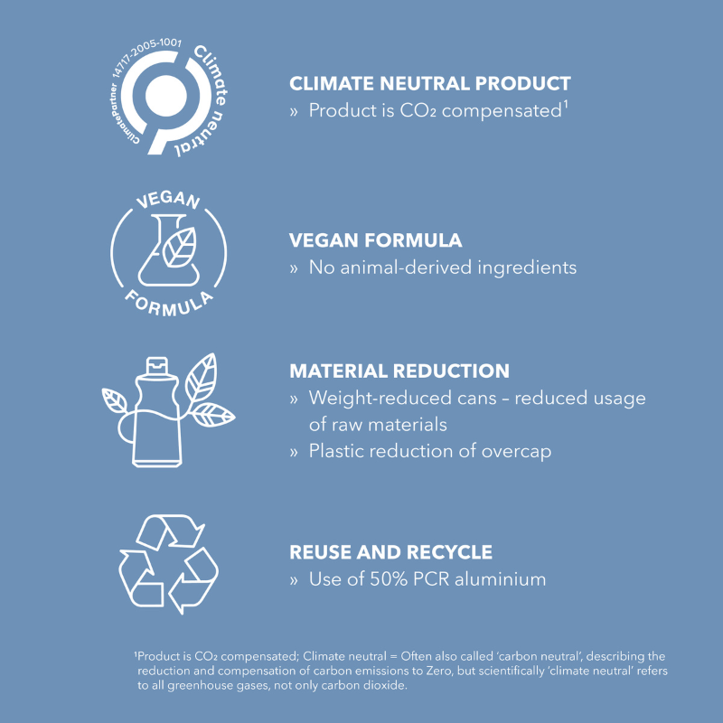 » Vegansk formel* » CO2 kompenseret** » Dermatologisk testet » Udviklet og produceret i Tyskland