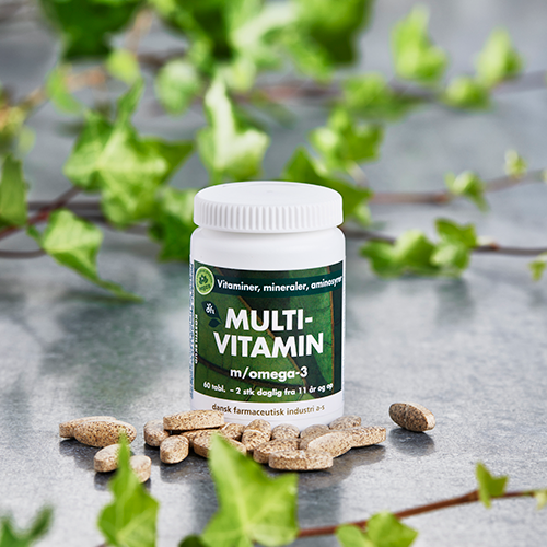 Multivitamin med 13 vitaminer, 11 mineraler, aminosyrer og omega-3. Støtter immunforsvar, energi og velvære. Synkevenlige tabletter, 2 måneders forbrug.