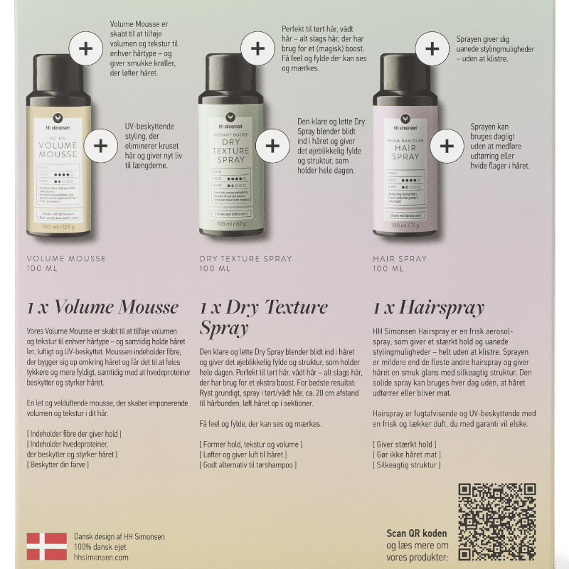 Skab volumen, tekstur og hold med HH Simonsens stylingtrio. Sættet giver dig tre uundværlige produkter, der arbejder sammen for at løfte håret, forme frisuren og sikre et let, fleksibelt og langtidsholdbart resultat – hver eneste dag.