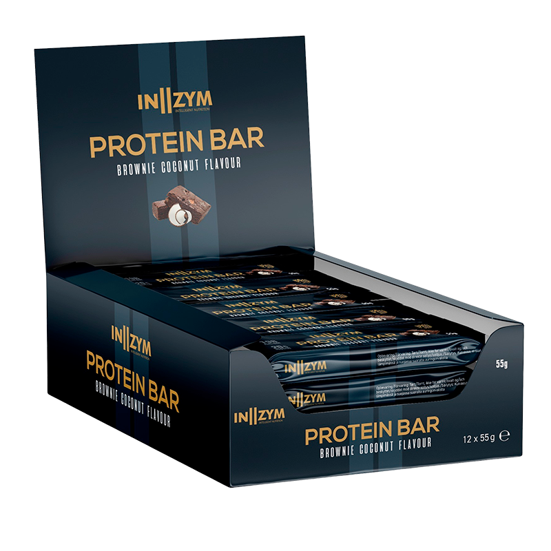 Proteinbar med højt proteinindhold og uden tilsat sukker, med smag af Brownie / Coconut. INZYM Proteinbar er en velsmagende protein bar på 55 gram med et højt proteinindhold fra kvalitetsprotein. Som alle vores andre produkter, er baren velsmagende og indeholder kun de bedste ingredienser.