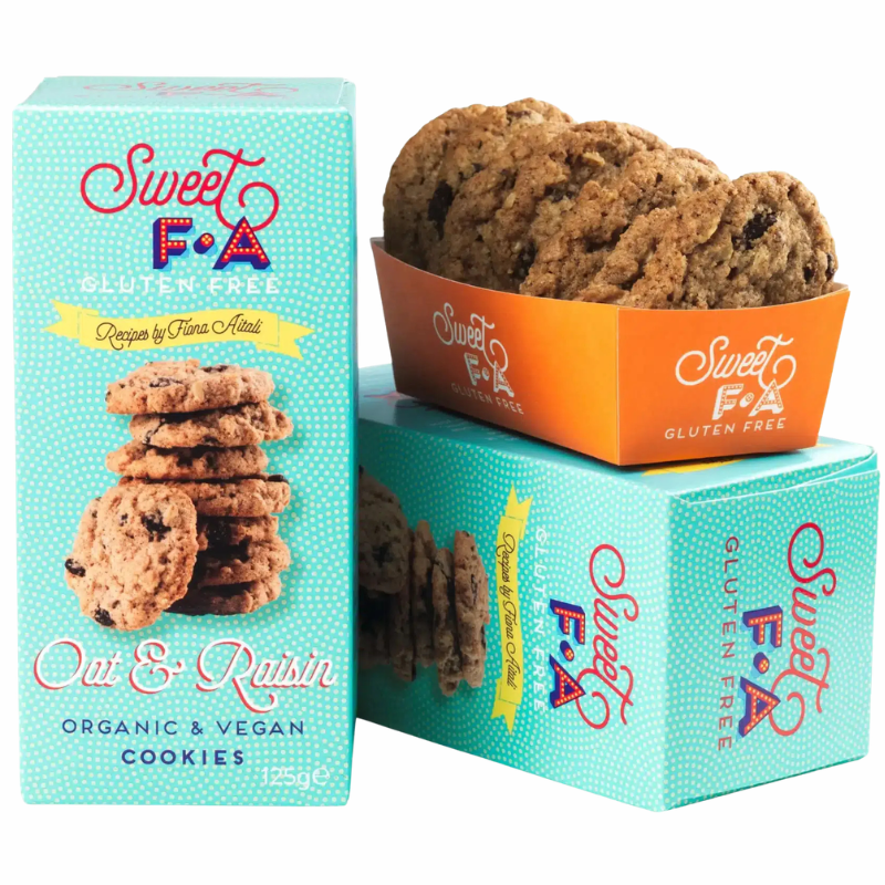 Økologiske og glutenfri cookies med havre, rosiner og et strejf af kanel. Sprøde og smagfulde – lavet på havre-, mandel- og tapiokamel.