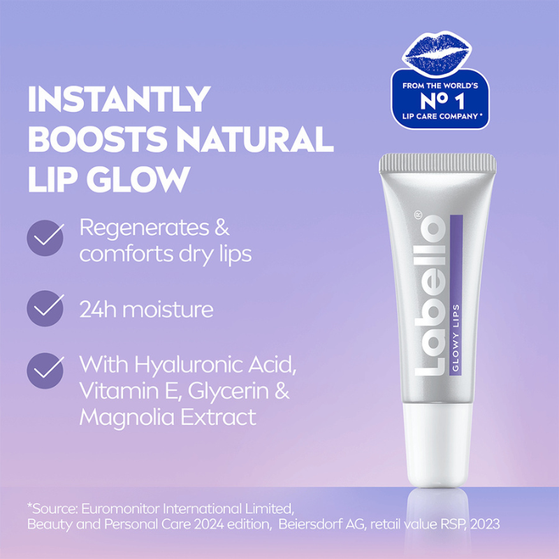 Labello® GLOWY LIPS booster øjeblikkeligt din egen naturlige læbeglød. For friske og synligt glansfulde læber med 24 timers fugt.