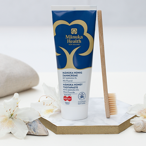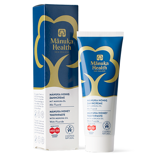 Specielle formel med MGO 250+ Manuka honning Tandpasta med fluor, uden SLS og 99,2% af naturlig oprindelse. Den specielle formel med MGO 250+ Manuka honning, Manuka olie og naturlige planteekstrakter plejer og beskytter effektivt tænder og tandkød.