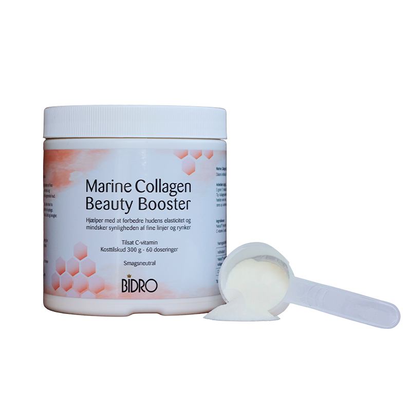 Marine Collagen Beauty Booster er en smagløs type 1 kollagen fra fisk. Kollagenet er med en lav molekylvægt (2000 Da) for en bedre optagelse.