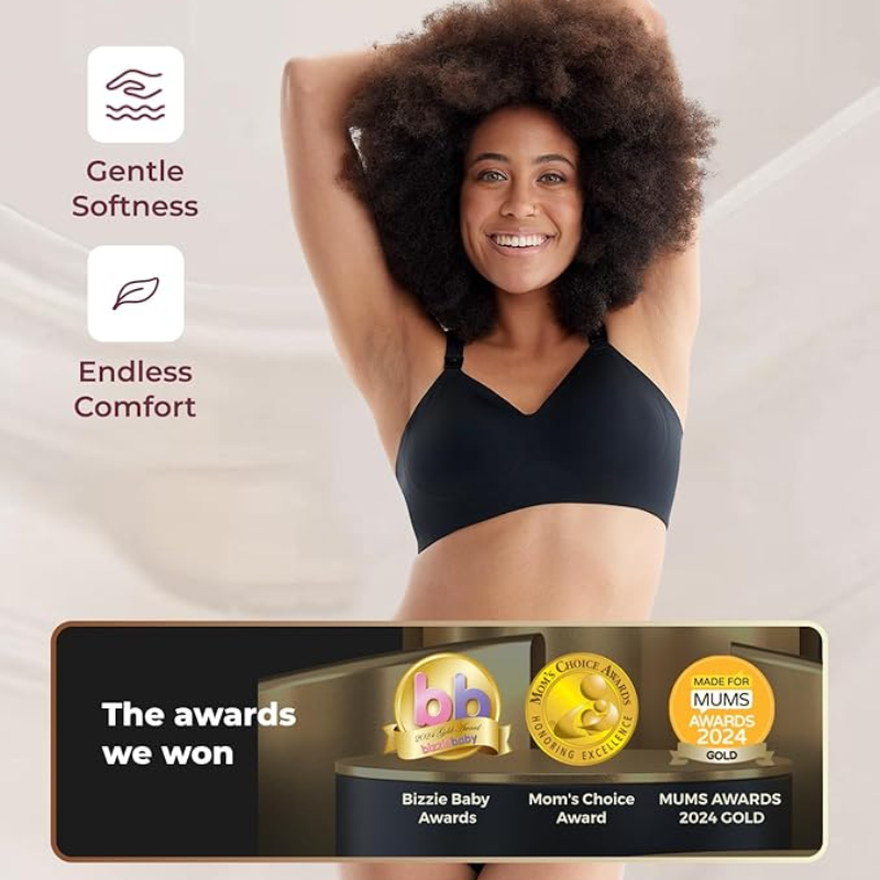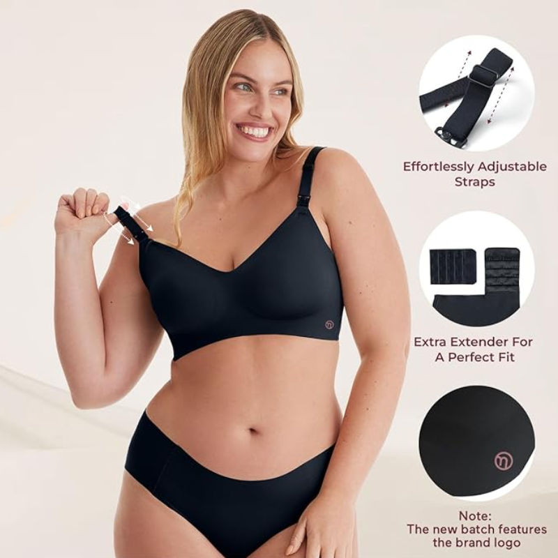 Momcozy YN21 Ammebh i Sort tilbyder smørblød, åndbar komfort med sømløs, trådløs støtte. Den har justerbare puder, et blødt bånd og en én-hånds lukning, hvilket gør den perfekt til amning, pumping og daglig brug.