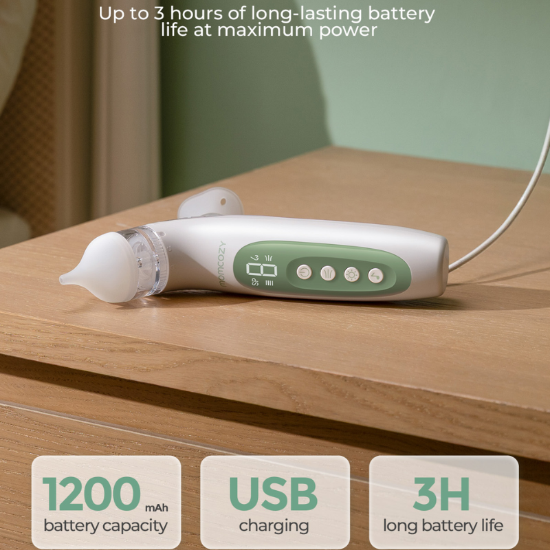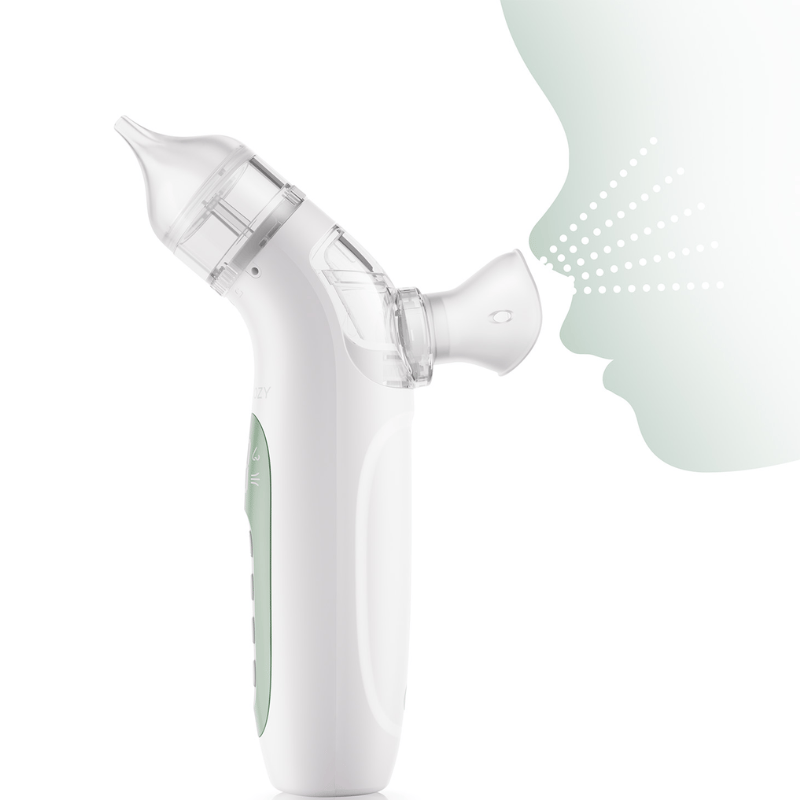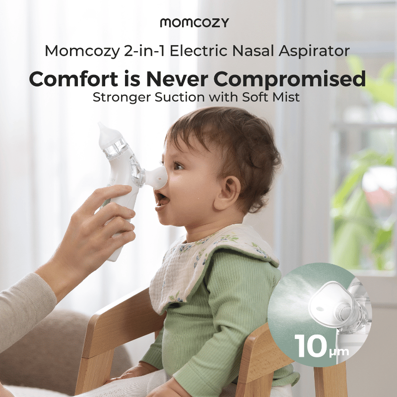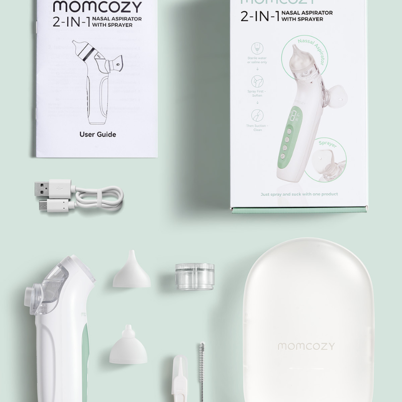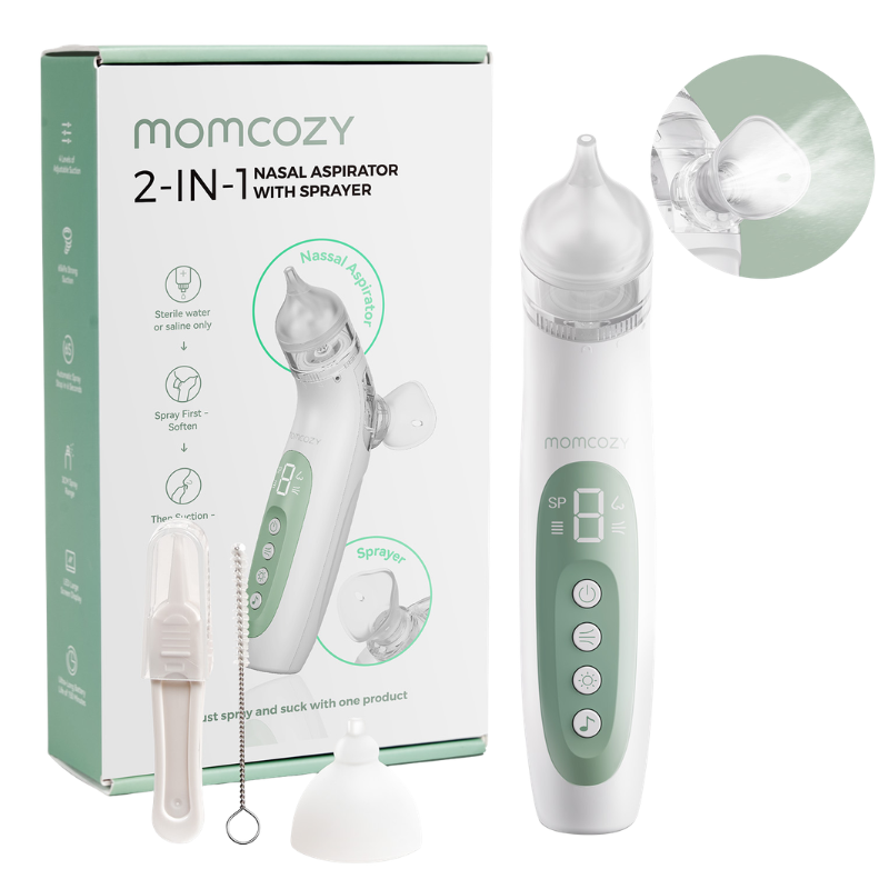 Momcozy BreezyClear™ 2-i-1 Spray & Suction Elektrisk Baby Nasal Aspirator kombinerer ultrafin tågespray og hospitalskvalitets sugekraft for hurtigt og skånsomt at fjerne tilstopning, hvilket genopretter nem vejrtrækning for børn i alderen 2-12 år.