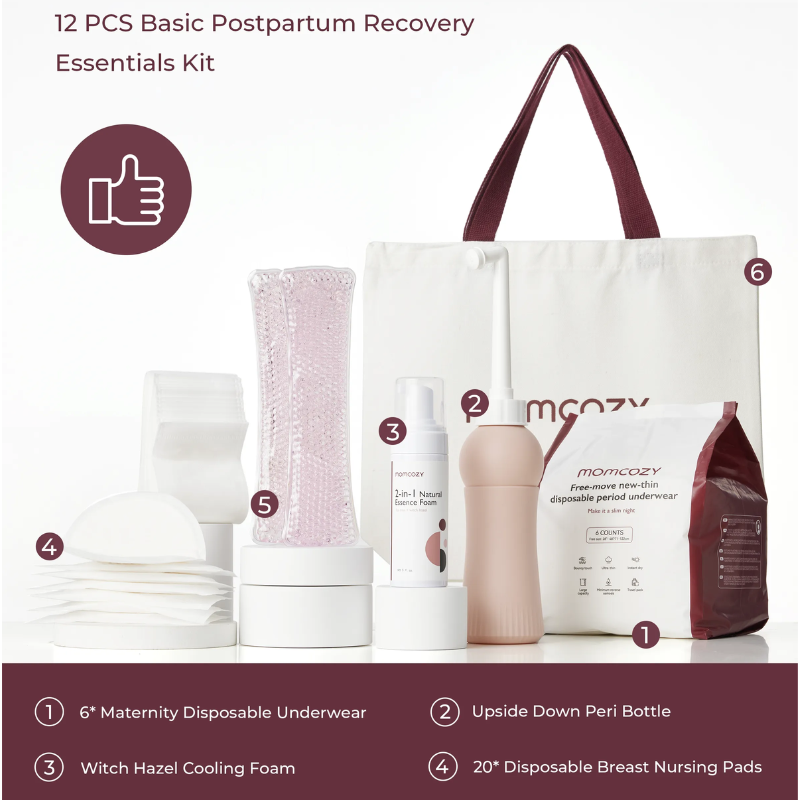 Momcozy postpartum recovery kit tilbyder nybagte mødre komfort og pleje med 12 lækagesikre underbukser, 4 øjeblikkelige kolde pakker, en ergonomisk peri flaske på 500 ml, beroligende tea tree & heksehasse skum, og en genanvendelig lærredspose.