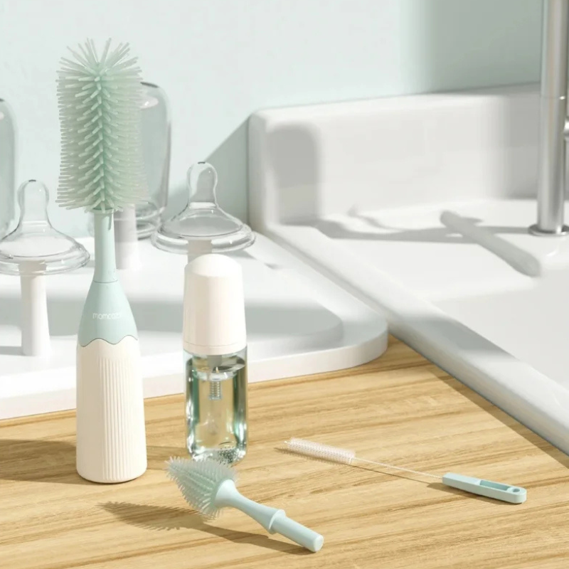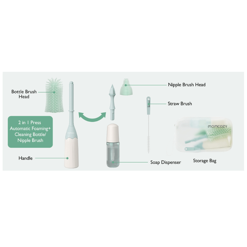 Momcozy Push-Press Design Kit er et revolutionsartet rengøringssæt til flasker, der indeholder en skumdoserende silikonebørste til tæt, grundig rengøring. Med ultra-bløde, ridsefri børstehår, flere børstehoveder og fødevaregodkendte materialer sikrer det sikker, alsidig og praktisk rengøring af flasker, sutter og sugerør.