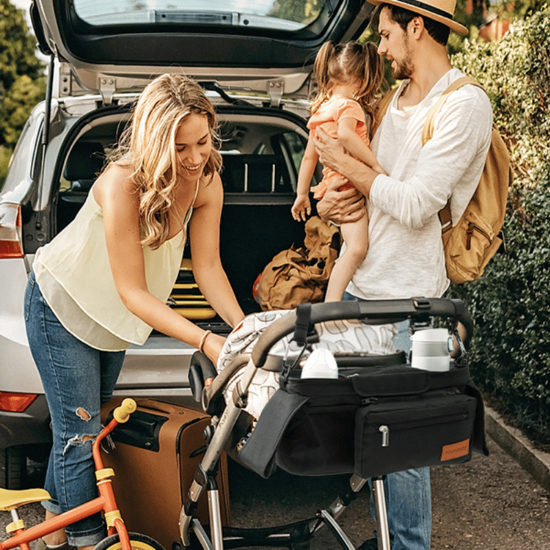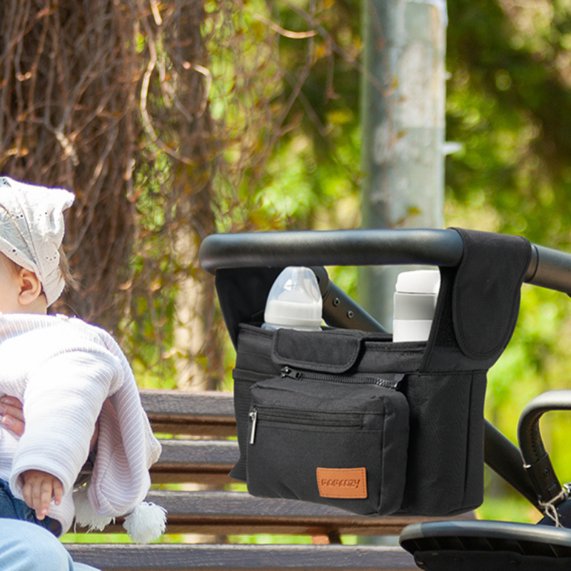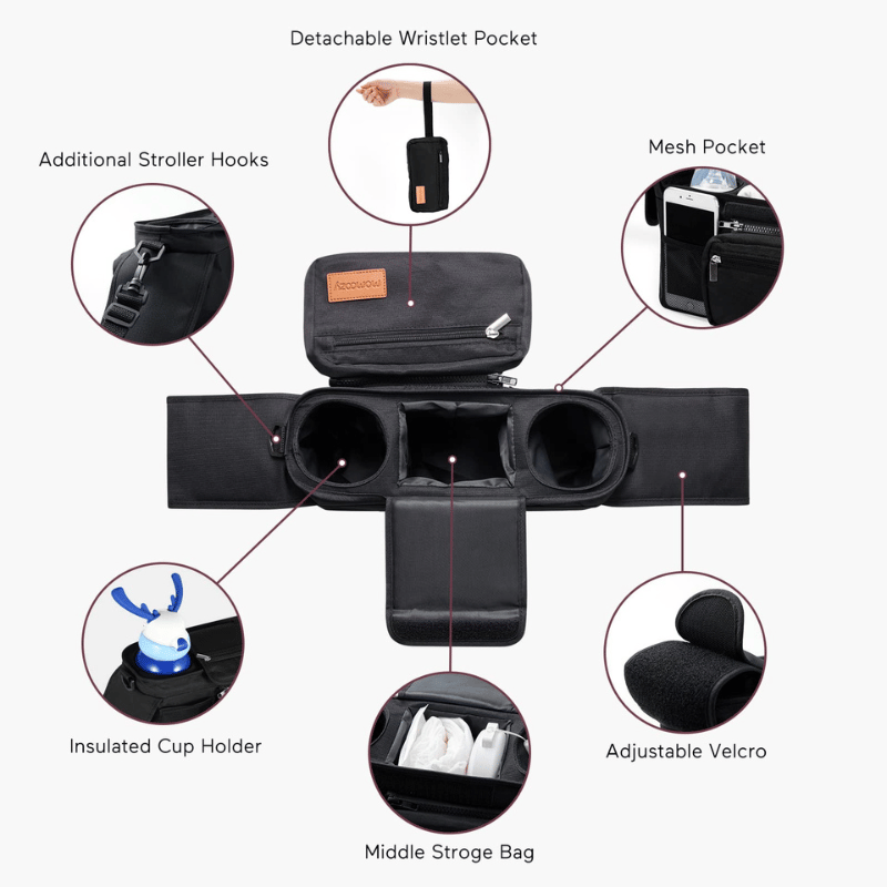 Momcozy Organizer passer til de fleste klapvognsstænger og håndtag og holder sikkert på flasker og kopper, samtidig med at der er nem adgang til telefoner og det nødvendige. Hold dig organiseret og nyd bekymringsfrie udflugter med din baby.