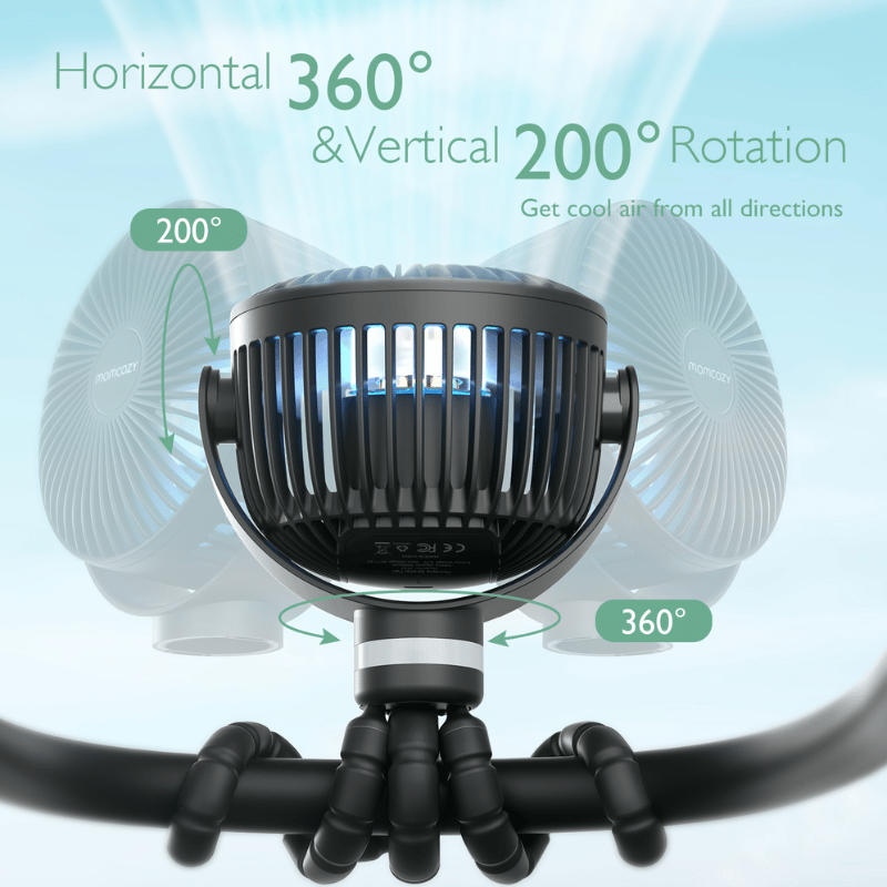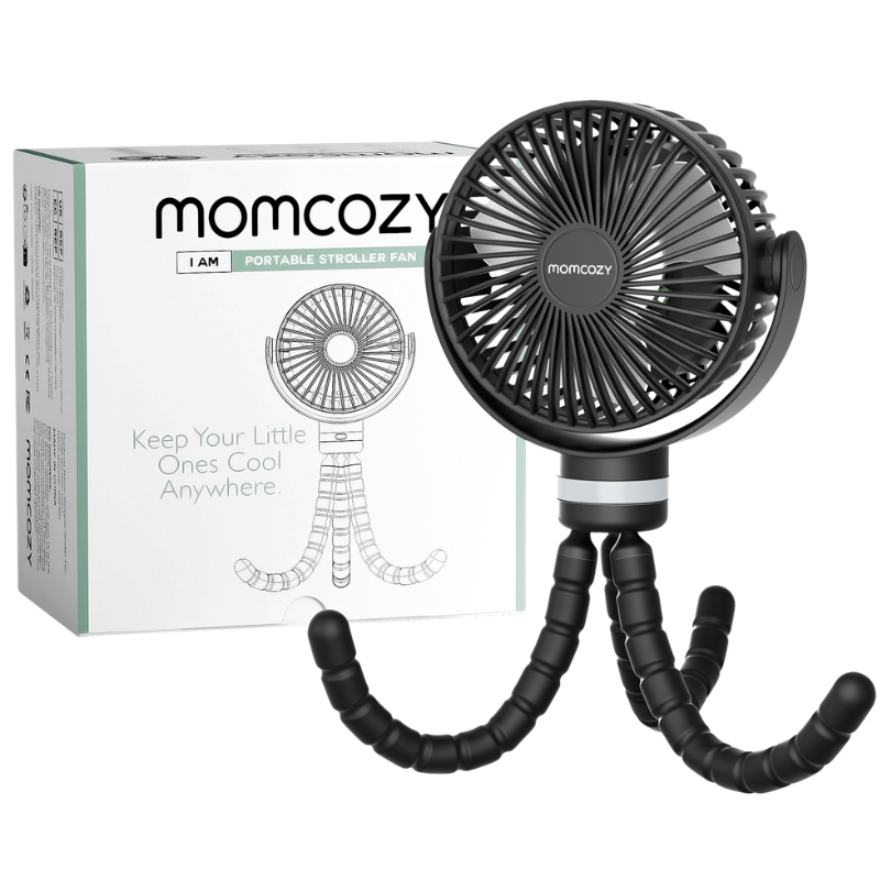 Momcozy Portable Fan har en ultralang batterilevetid (12-27 timer), 360° rotation, 4 hastigheder og et babyvenligt design med LED natlys. Dens fleksible tripod kan fastgøres hvor som helst, hvilket gør den perfekt til klapvogne, rejser og hjemmebrug.