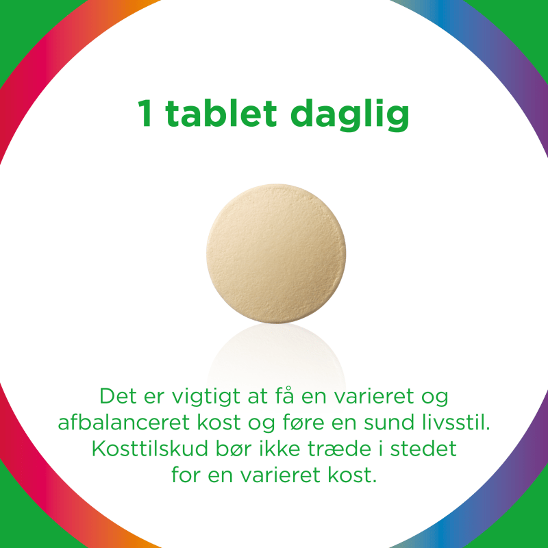 "Kosttilskud. Tabletten bør indtages i forbindelse med et måltid. Anbefalet daglig dosis bør ikke overskrides. Det er vigtigt at få en varieret og afbalanceret kost og føre en sund livsstil. Kosttilskud bør ikke træde i stedet for en varieret kost. Opbevares uden for små børns rækkevidde, tørt og ved stuetemperatur (under 25°C)."