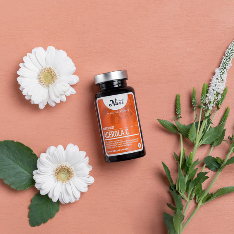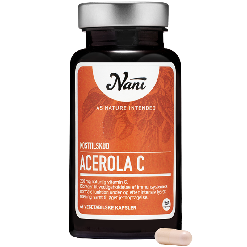 Nani Acerola C vitamin er et C vitamin kosttilskud bestående af tørrede og pulveriserede acerola kirsebær.