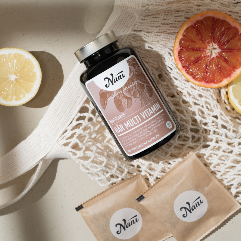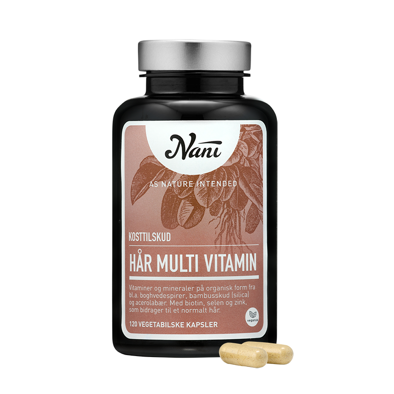 Hår multivitamin på organisk form fra Nani. Med biotin, selen og zink, som bidrager til et normalt hår. Samt bambusskud ekstrakt der indeholder et naturligt højt indhold af organisk silica.
