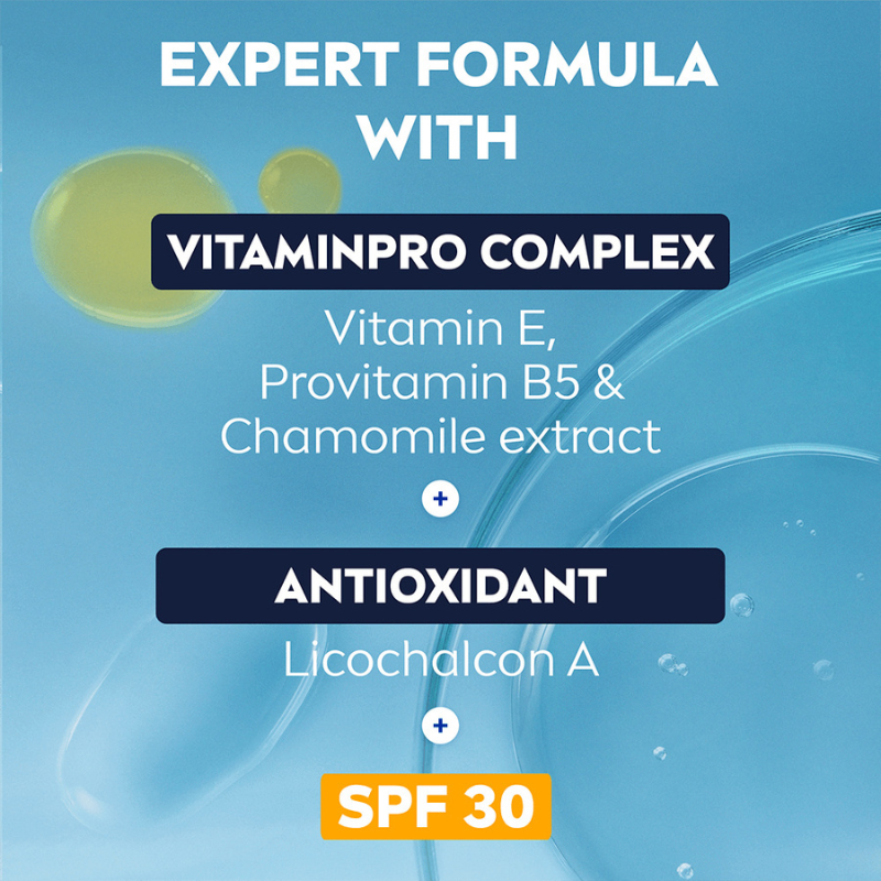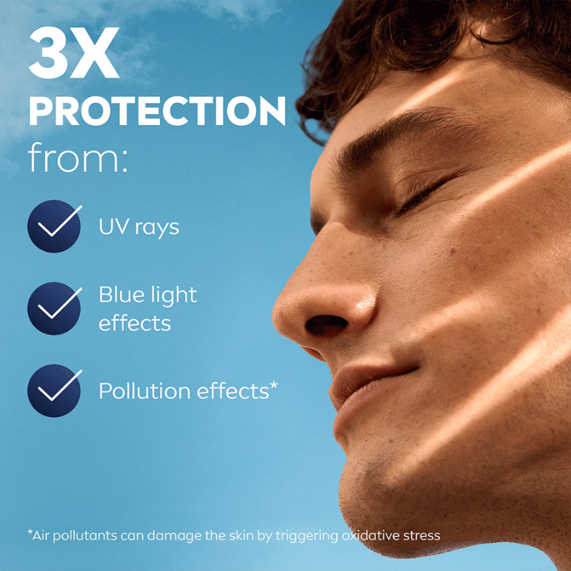 NIVEA MEN Sensitive Daily Protect Moisturiser beskytter følsom hud med SPF30, VitaminPRO Complex og antioxidanter. Den er let, ikke-fedtende og alkoholfri* og giver 3 gange beskyttelse mod UVA/UVB-stråler, blåt lys og forurening for en sund og fugtet hud hele dagen.