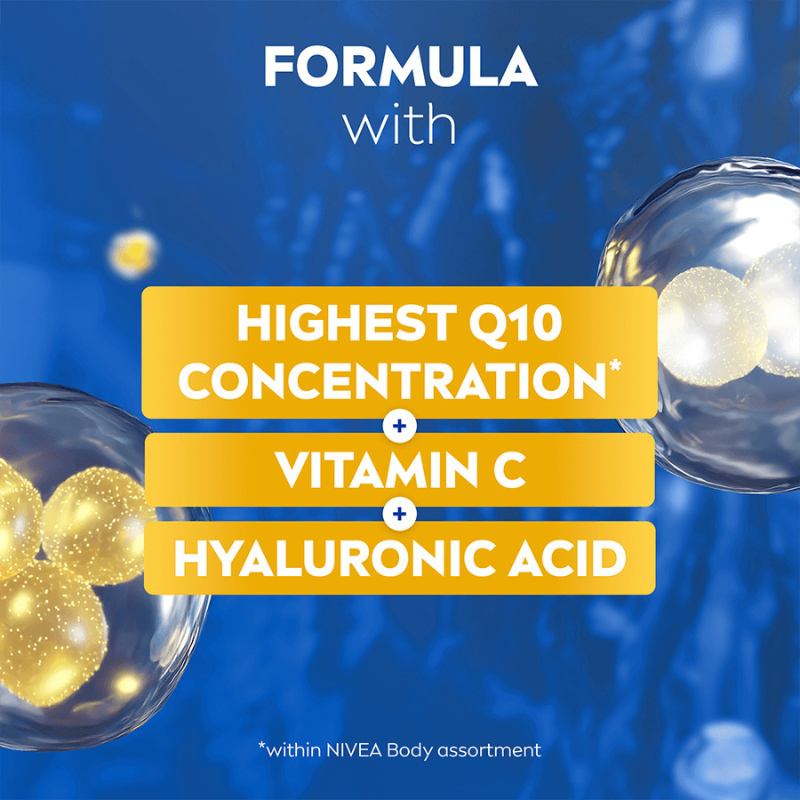 NY NIVEA Q10 Firming & Energizing Body Serum-Lotion med vores højeste koncentration af ren Q10*, C-vitamin og hyaluronsyre. Hyaluronsyre opstrammer huden på bare 7 dage og giver straks en energisk hudfølelse. *Inden for NIVEA Body-sortimentet