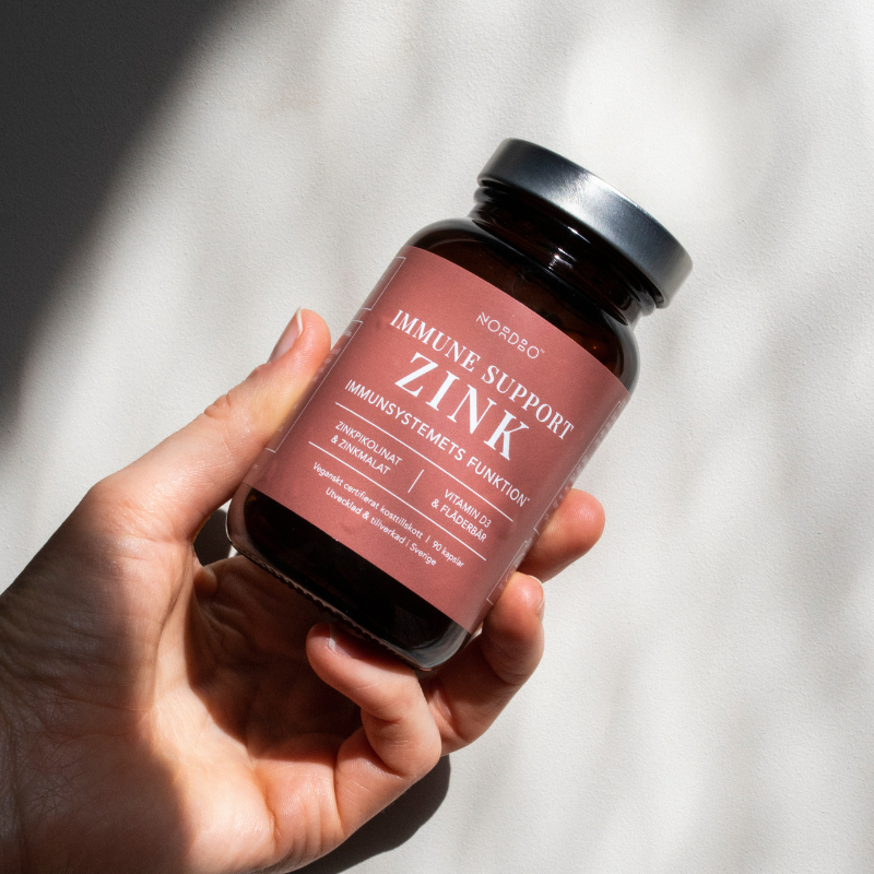 Nordbo Immune Support Zink indeholder 4 aktive ingredienser: zinkpikolinat og zinkmalat i kombination med sort hyldebærekstrakt og D3-vitamin.
