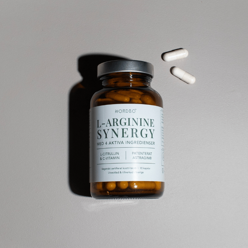 NORDBO L-Arginine Synergy indeholder aminosyrerne L-arginin og L-citrullin med C-vitamin (calciumascorbat) og Astragin®.