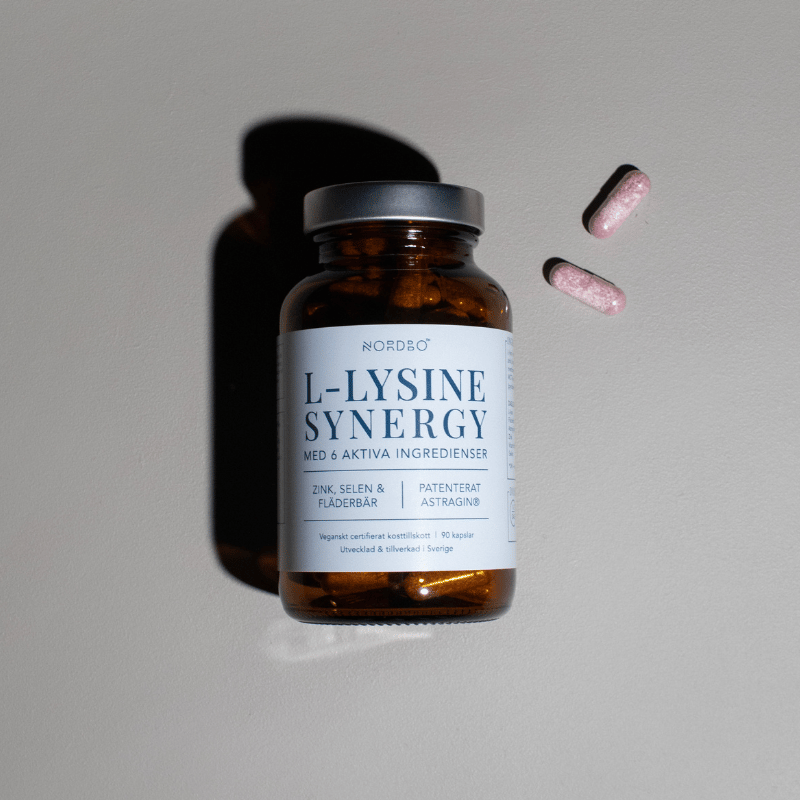 NORDBO L-Lysine Synergy indeholder den essentielle aminosyre L-lysin i kombination med zink, selen, hyldebær, vitamin B6 og Astragin®.