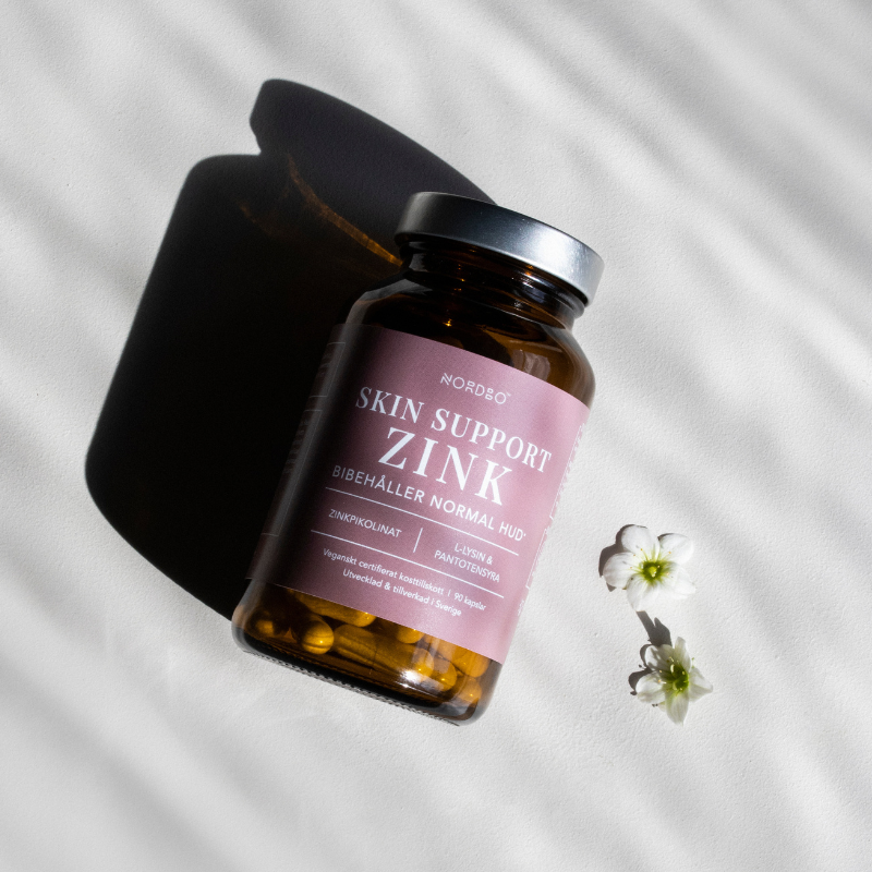 Nordbo Skin Support Zink indeholder tre aktive ingredienser: zinkpikolinat, L-lysin og pantothensyre (vitamin B5).