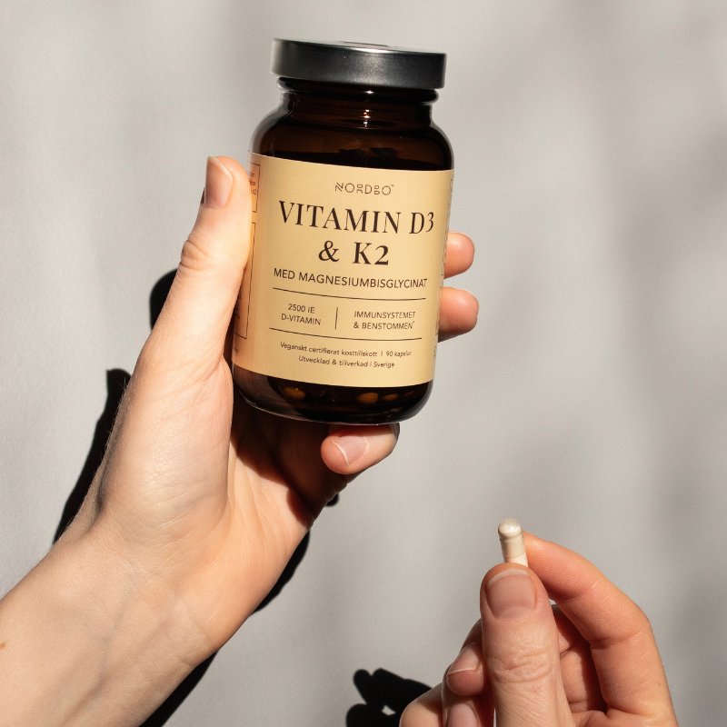 Nordbo Vitamin D3 & K2 er en kombination og indeholder bl.a. biologisk aktivt vitamin D3 (D3V®) fra alger.