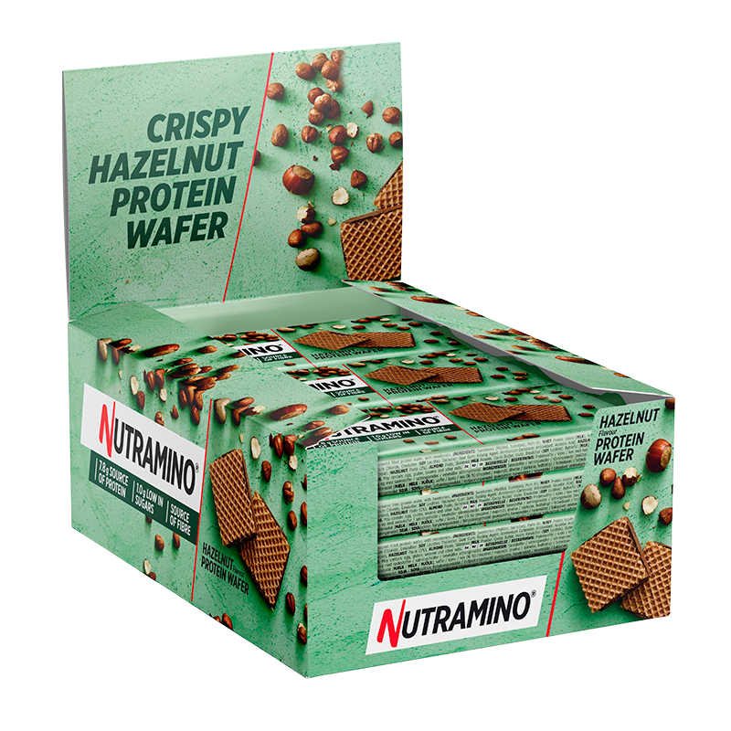 Fyldt proteinwafer med hasselnødsmag, med sødestoffer. PROTEINWAFEL MED FYLD AF CHOKOLADE OG SMAG AF HASSELNØD Lækre snack, der er perfekt på farten. Waflen er med smag af hasselnød og har et lavt indhold af sukker.