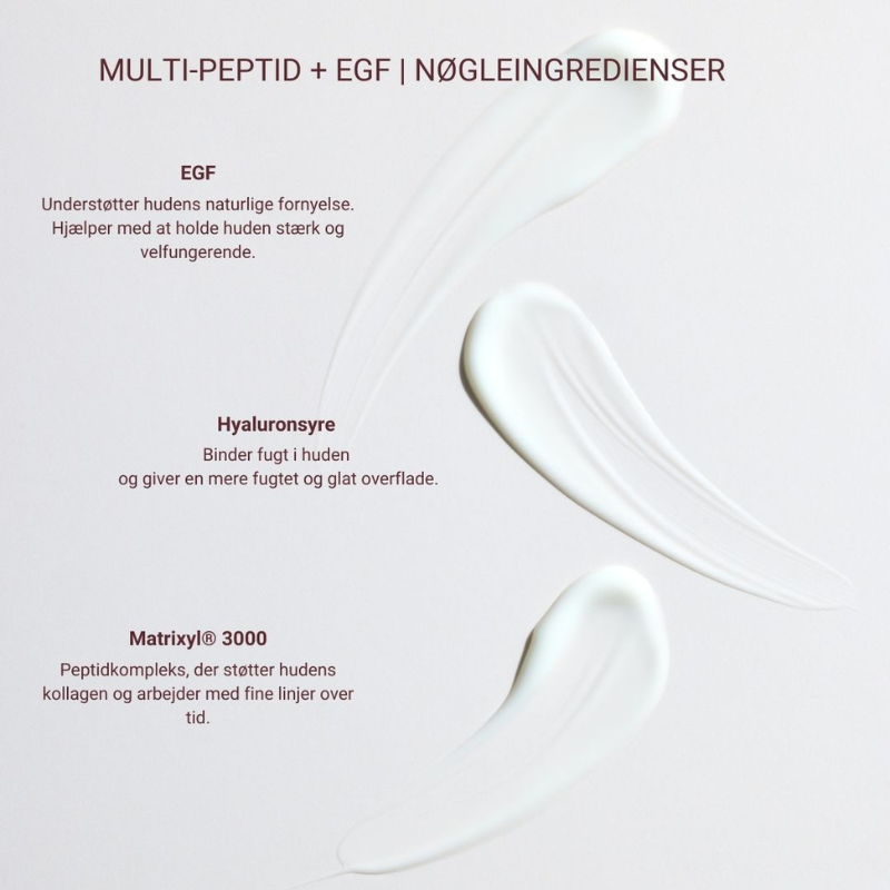 Pudderdåserne Multi-Peptid + EGF (Epidermal growth factor) er et serum, der er formuleret med en høj koncentration af seks nøje udvalgte peptider. De bidrager alle til synligt fastere og glattere hud i hele ansigtet og omkring øjnene.