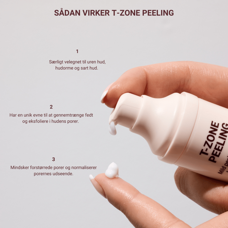 T-Zone Peeling fra Pudderdåserne er en mild peeling til ansigtet, der mindsker urenheder. Peelingen eksfolierer hudens overflade, renser porerne i dybden, modvirker hudorme og forbedrer samtidig hudens cellefornyelse. Peelingen skal ikke vaskes af, og resultatet er en glattere, renere og mere spændstig hud med sund glød. T-Zone Peeling fra Pudderdåserne kan bruges til alle hudtyper, men særligt fedtet eller uren hud vil have stor gavn af peelingen.